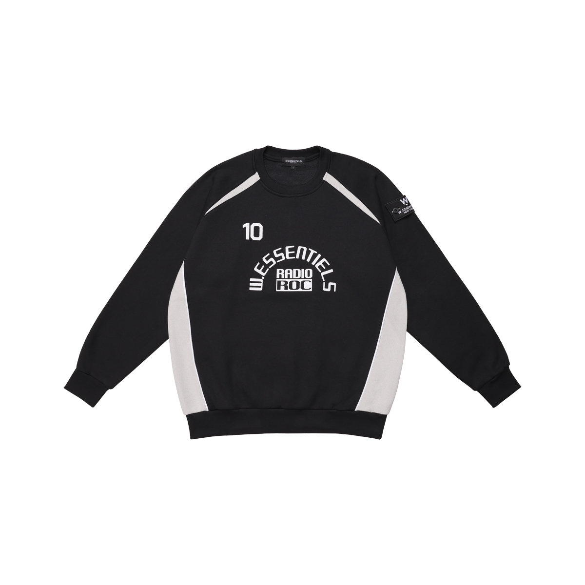The front is stamped with the label’s signature W.ESSENTIELS RADIO ROC motif, drawing inspiration from vintage broadcast aesthetics and underground club culture. A subtle “10” detail adds a nod to jersey-inspired design, while a branded rubber patch on the sleeve cements its streetwear credentials.