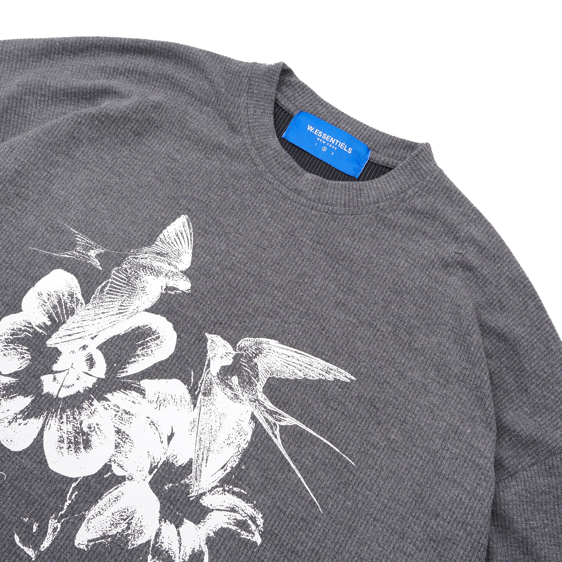 The MADNESS HIRONDELLE Sweater from W.ESSENTIELS Label Blue blends poetic stillness with a bold, urban edge. Crafted from soft waffle-textured cotton, this oversized piece features a delicate white screenprint of swallows and florals—imagery that captures fleeting beauty and tranquil rebellion.