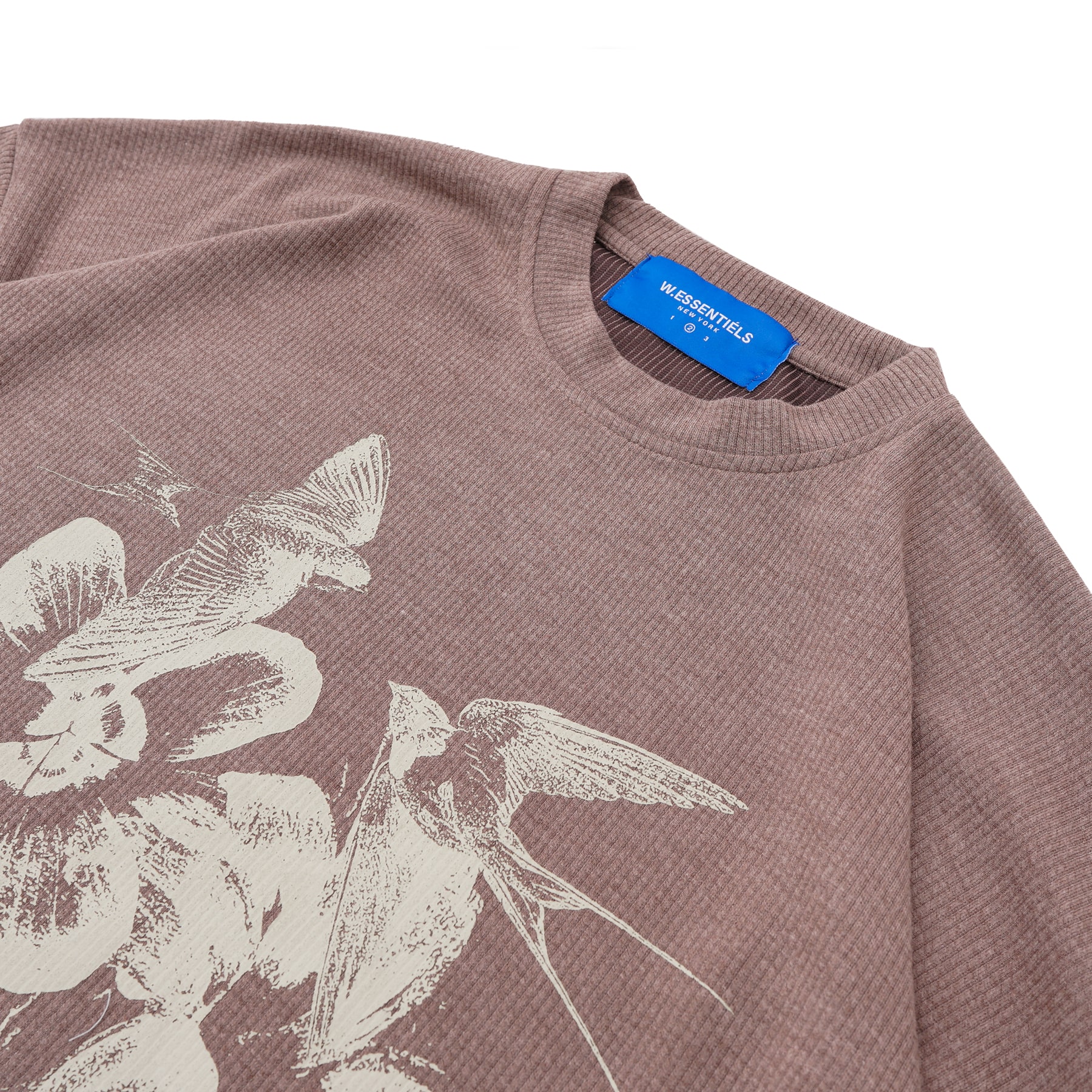 The MADNESS HIRONDELLE Sweater from W.ESSENTIELS Label Blue blends poetic stillness with a bold, urban edge. Crafted from soft waffle-textured cotton, this oversized piece features a delicate white screenprint of swallows and florals—imagery that captures fleeting beauty and tranquil rebellion.