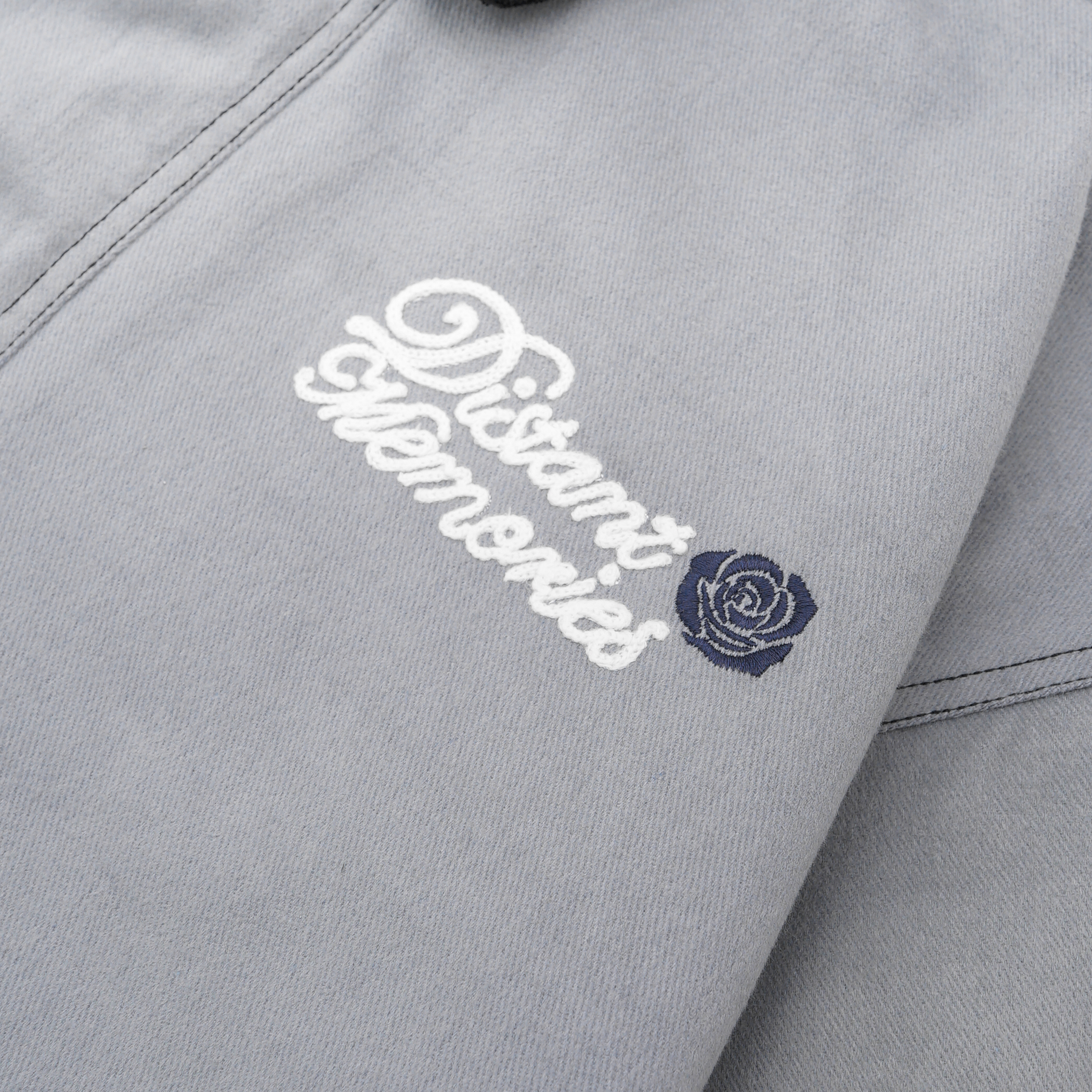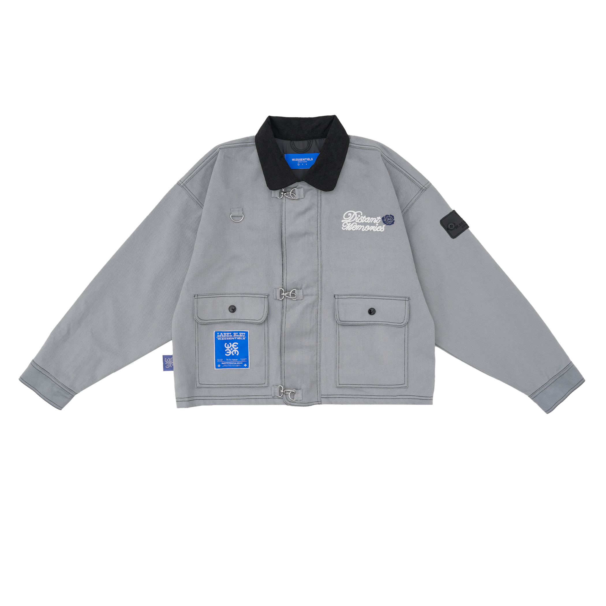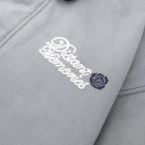 Pops of branding—a woven “Label Bleu” patch, embroidered “Distant Memories” script at the chest, and a tonal rubberized badge on the sleeve—offer a distinct graphic presence, while oversized flap pockets and adjustable cuffs ensure both function and flair.100% Cotton